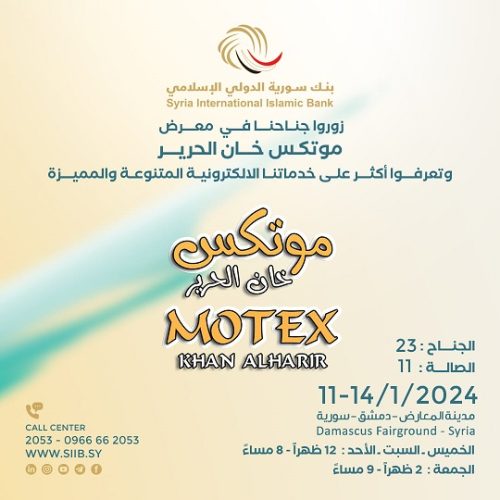يسر بنك سورية الدولي الإسلامي أن يعلن عن مشاركته في معرض موتكس- خان الحرير للألبسة والجلديات ومستلزمات الإنتاج، الذي سيقام برعاية رئيس مجلس الوزراء المهندس حسين عرنوس على أرض مدينة المعارض في دمشق بتاريخ 11 كانون الثاني 2024 ويستمر لمدة أربعة أيام، ويضم نحو 400 صناعي سوري ويعد من أكبر المعارض المتخصصة في عالم الصناعات النسيجية والبوابة الرئيسية للتصدير للخارج.