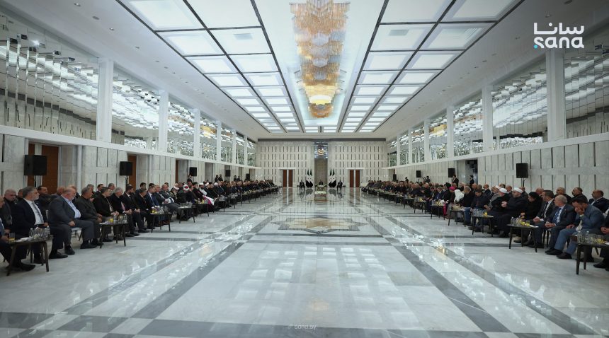 التقى الرئيس أحمد الشرع اليوم ” 13 كانون الأول ” في قصر الشعب بدمشق، وجهاء وأعيان محافظتي اللاذقية وطرطوس، بحضور محافظ اللاذقية محمد عثمان ومحافظ طرطوس أحمد الشامي، حيث جرى بحث عدد من القضايا الوطنية والخدمية والتنموية ذات الصلة بالمحافظتين.