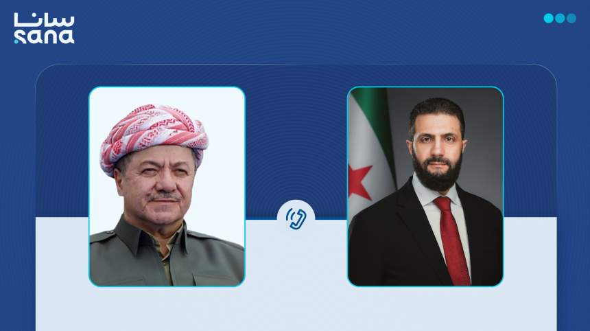 أجرى فخامة الرئيس أحمد الشرع اتصالاً هاتفياً مع السيد مسعود بارازاني رئيس الحزب الديمقراطي الكردستاني، جرى خلاله بحث مستجدات الأوضاع على الساحة السورية، وتطورات المنطقة، مع التأكيد على أهمية تعزيز الاستقرار والتعاون المشترك.