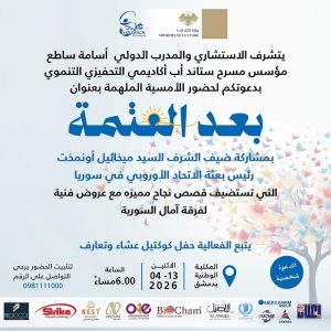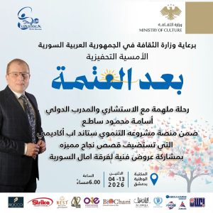 دعا فريق “ستاند اب أكاديمي” بقيادة مؤسسه المدرب الدولي أسامة ساطع، لحضور فعالية لافتة بعنوان ” بعد العتمة ” برعاية وزارة الثقافة، وذلك على مسرح المكتبة الوطنية في دمشق، وقد أوضحت بطاقة الدعوة محاور الفعالية وموعدها، حيث جاء فيها :