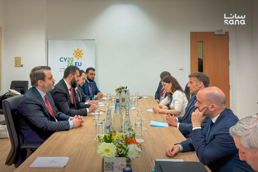 والتقى الرئيس أحمد الشرع الرئيس الفرنسي إيمانويل ماكرون، وعدداً من الرؤساء والزعماء بحضور وزير الخارجية والمغتربين أسعد حسن الشيباني، وذلك على هامش الاجتماع غير الرسمي للاتحاد الأوروبي والشركاء الإقليميين في العاصمة القبرصية نيقوسيا.